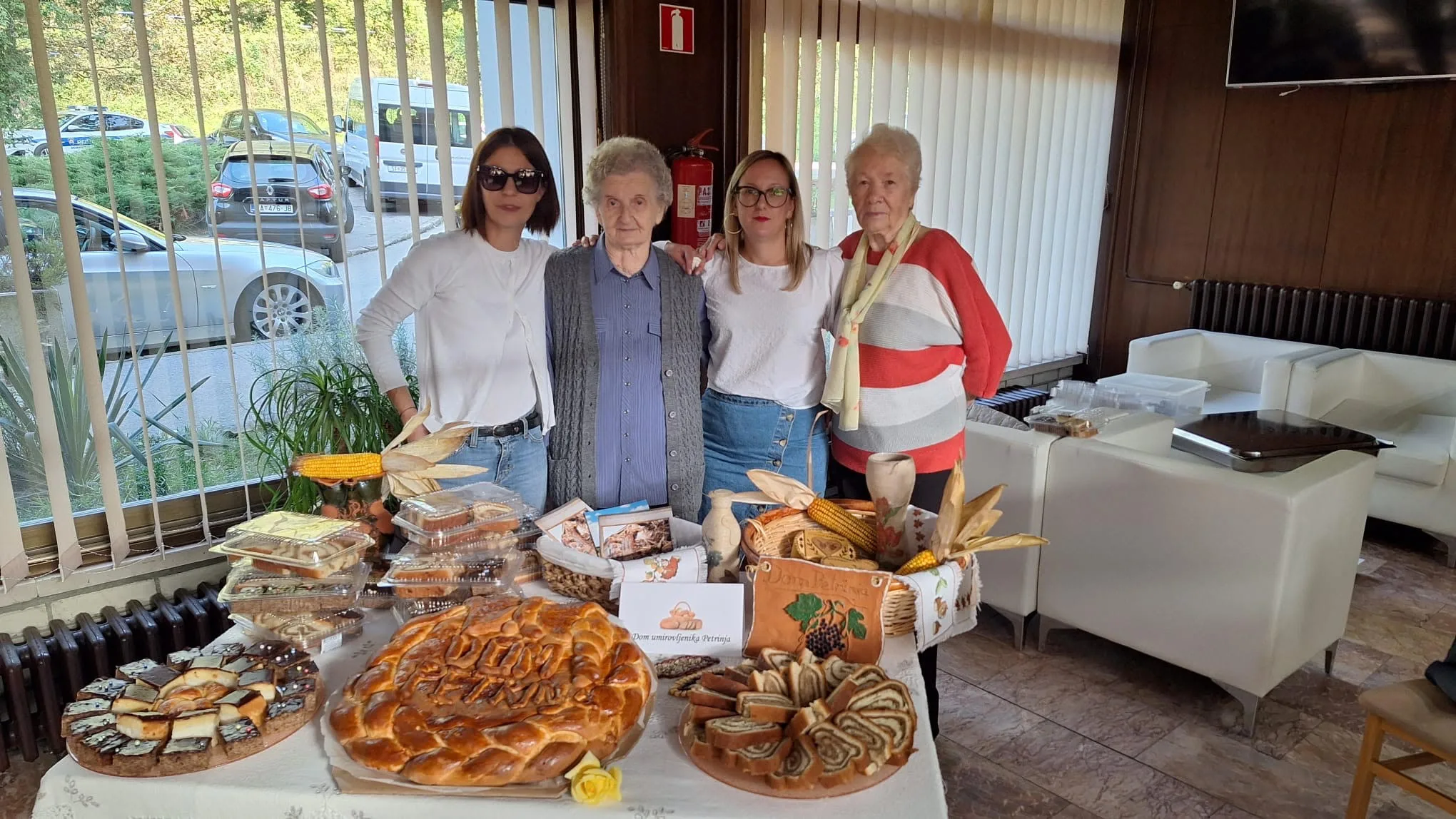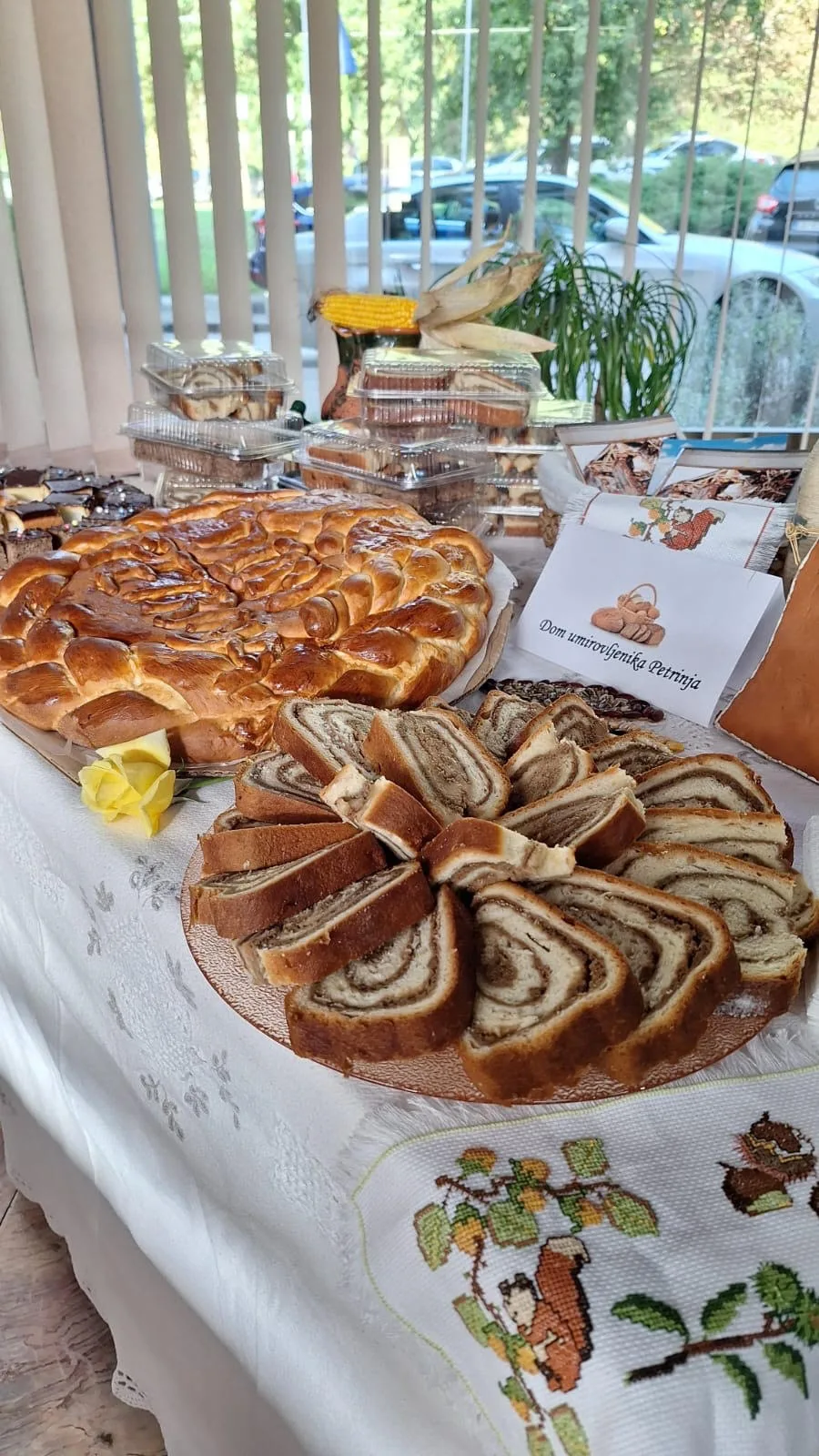 Djelatnici kuhinje Doma ove godine pripremili su prekrasnu pogaču s imenom ustanove, pravu domaću “orehnjaču”, kolač od rogača i kokosa te tako u pravom sjaju predstavili našu ustanovu na izložbi. Stol Doma Petrinja nije prošao nezapaženo pa su korisnici Doma bili jako ponosni na svoju kuću i izložene radove.